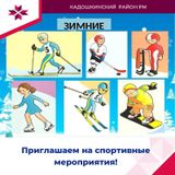 - Массовое катание на коньках (территория ФОК рп. Кадошкино ул. Светотехническая, 6а (ледовый каток) и Массовое катание на лыжах (Стадион «Электротехник» рп. Кадошкино ул. Заводская)